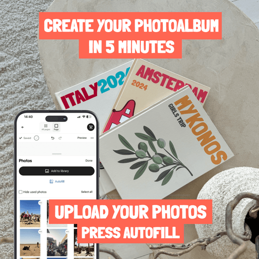 Ordering our travel book is super easy and only takes 5 minutes! Simply choose your cover, upload your photos, and our system will automatically arrange them with the “autofill” feature.